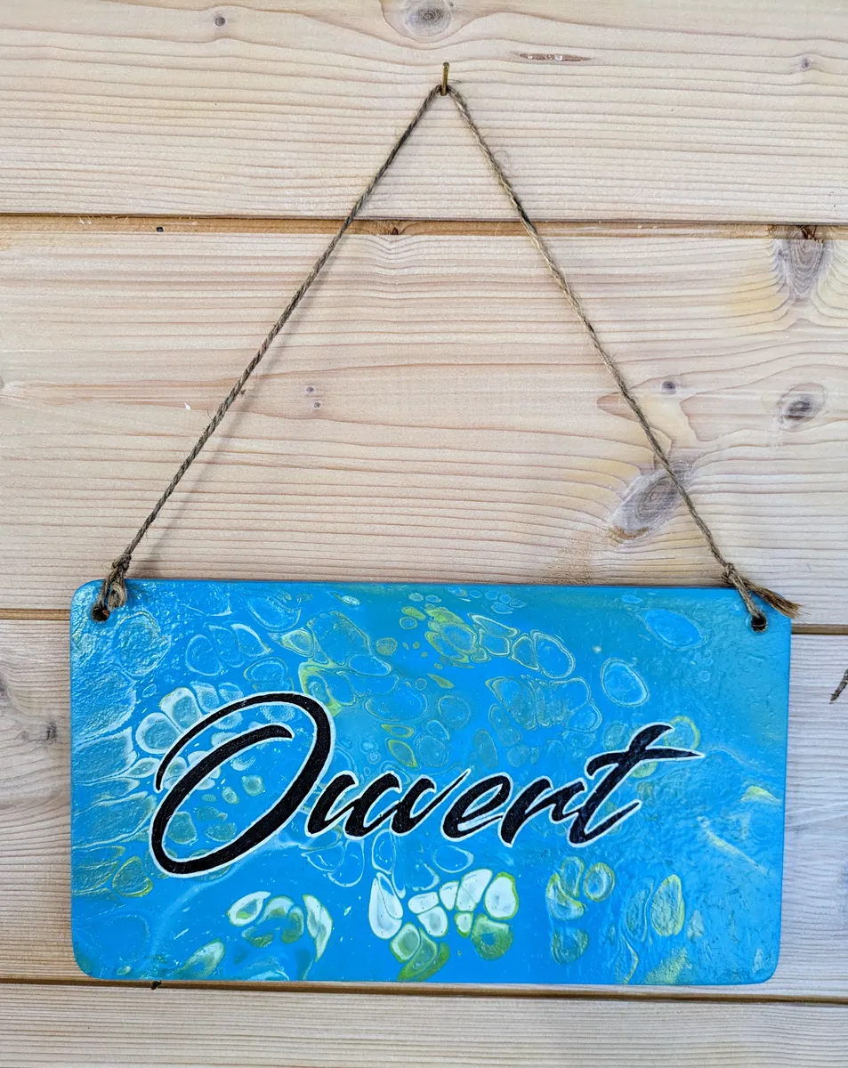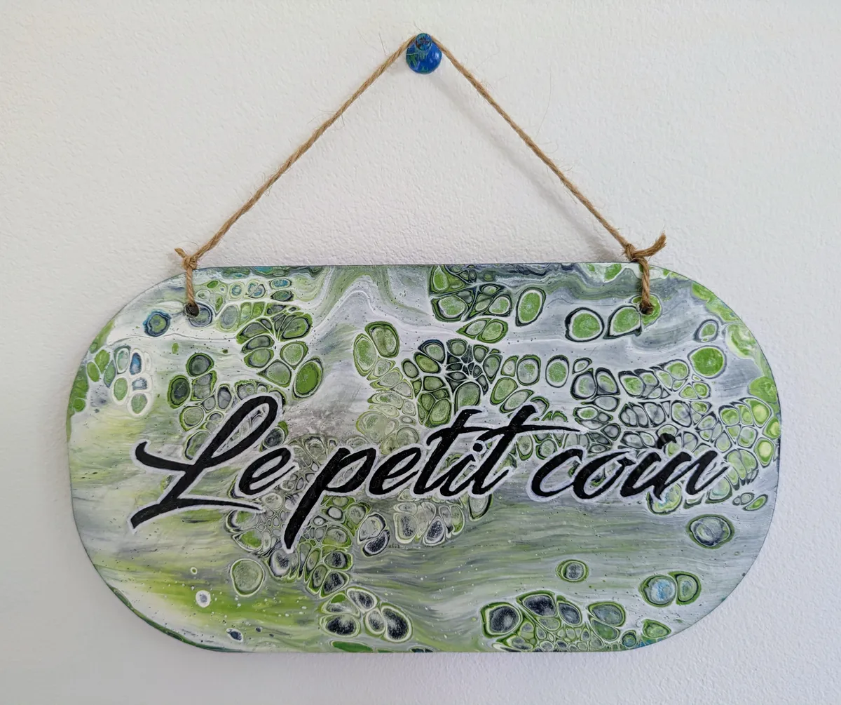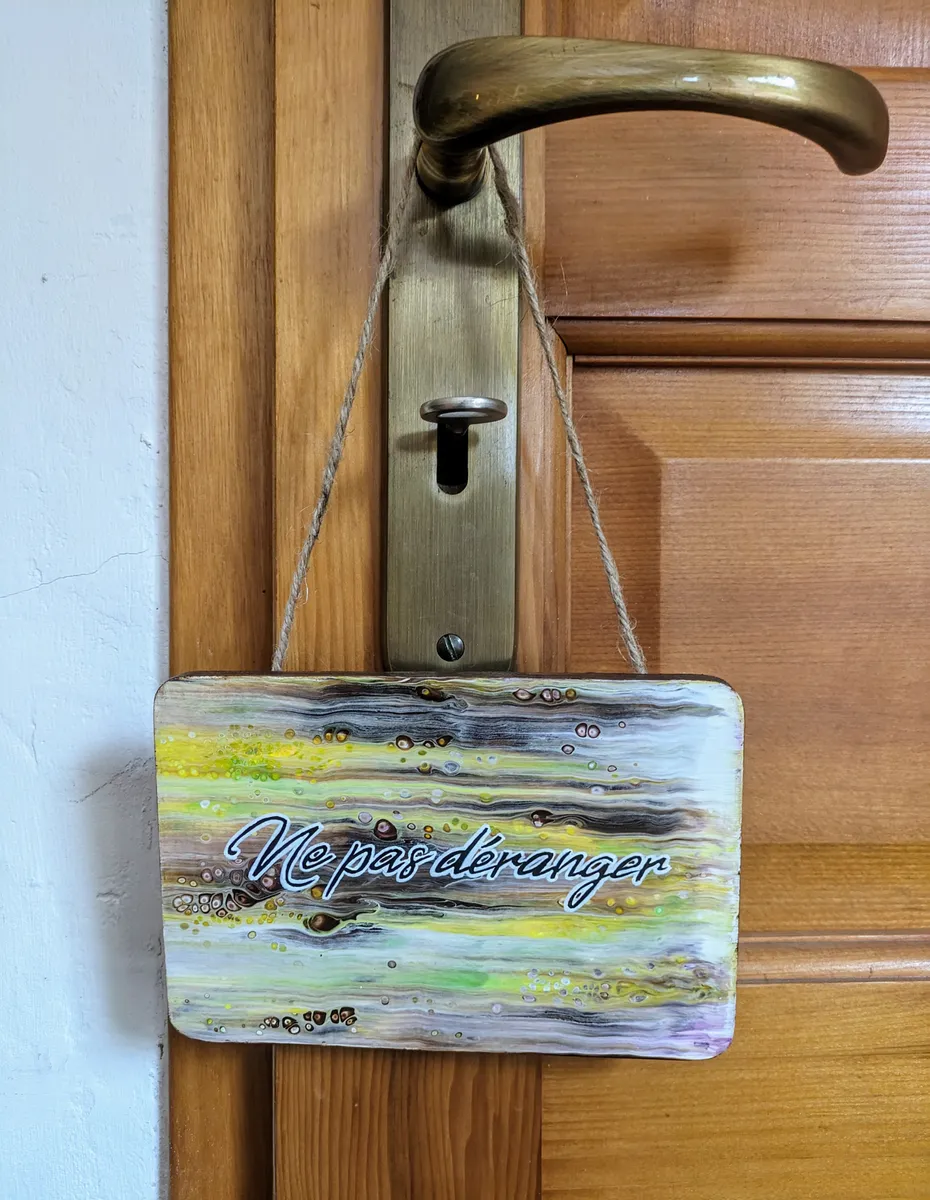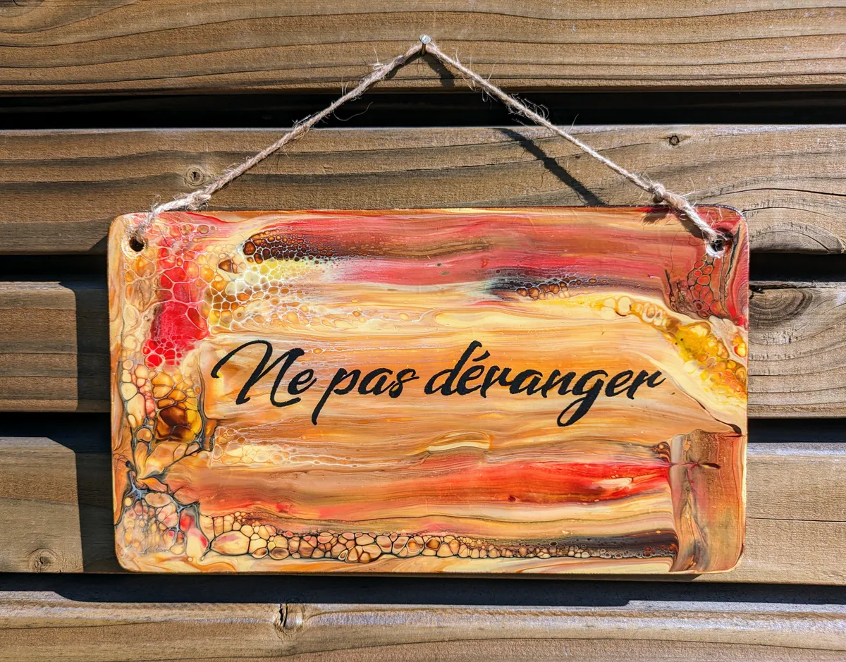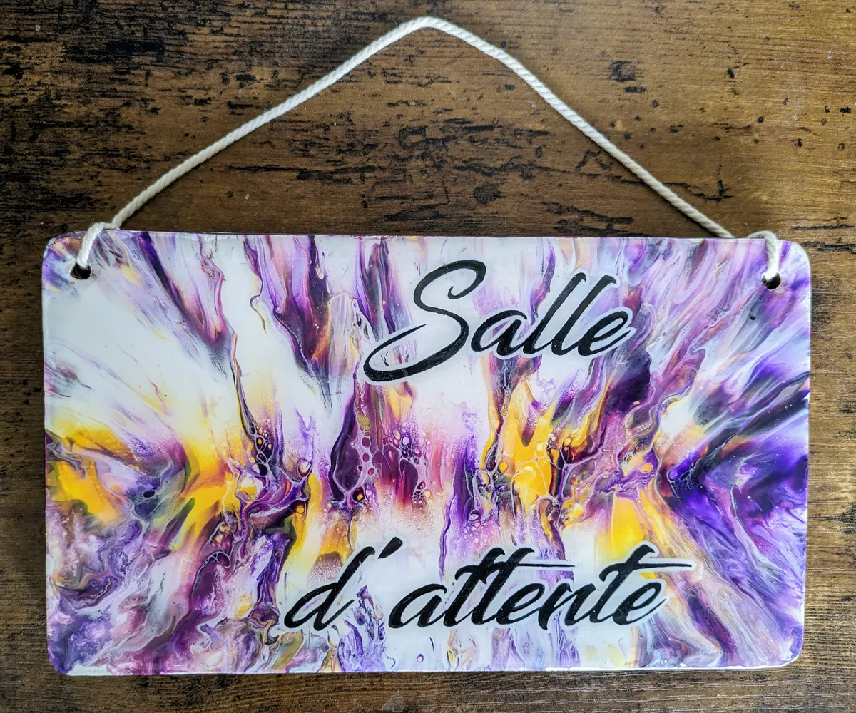 Découvrez les dessous de plat, dessous de verre, plaques de porte ou horloges qui apporteront une touche de couleur et d’originalité dans la maison. La peinture est coulée sur du bois ou de la faïence et recouverte d’une couche de résine qui la protège (poussière, UV, chaud, froid...) et lui donne un effet cristallin.