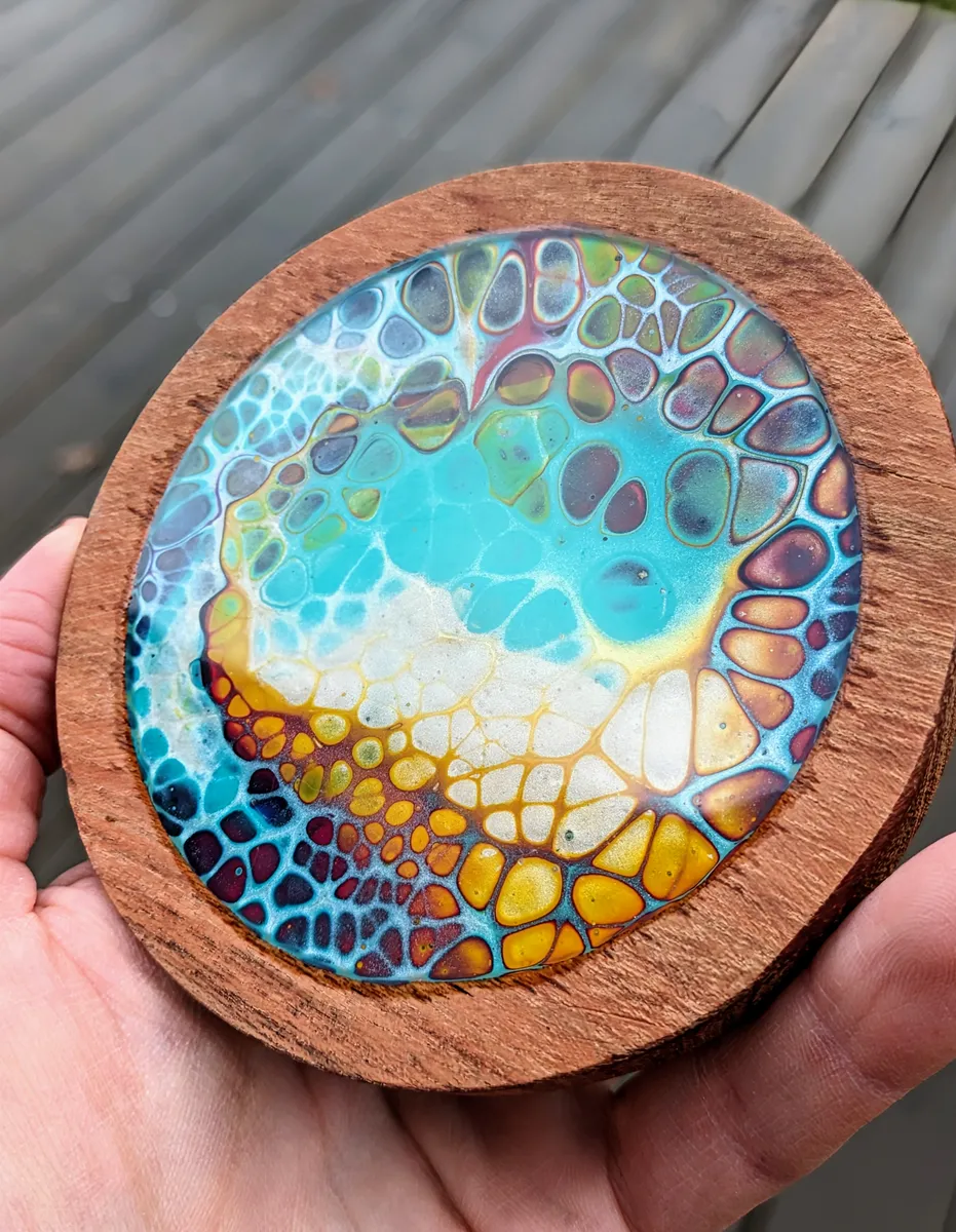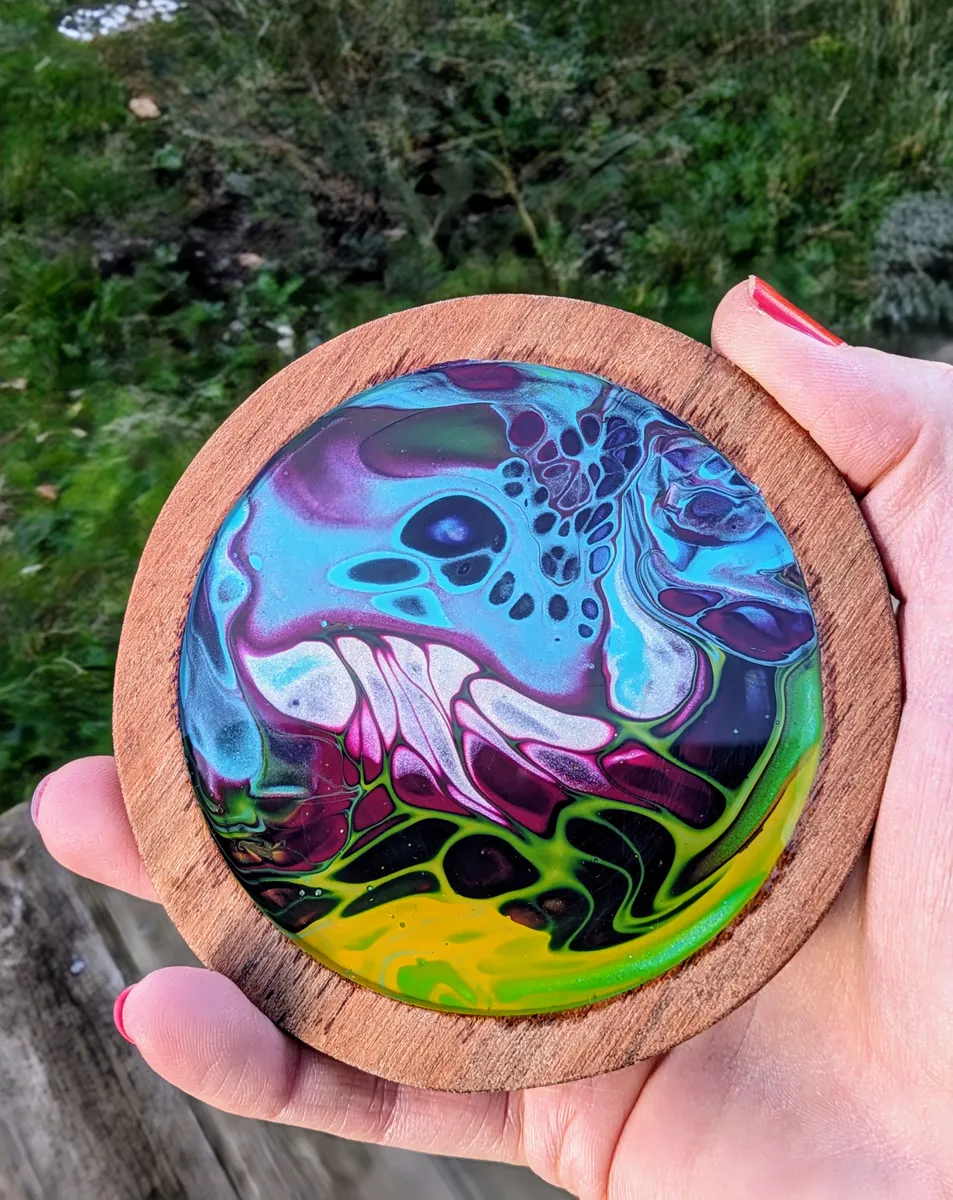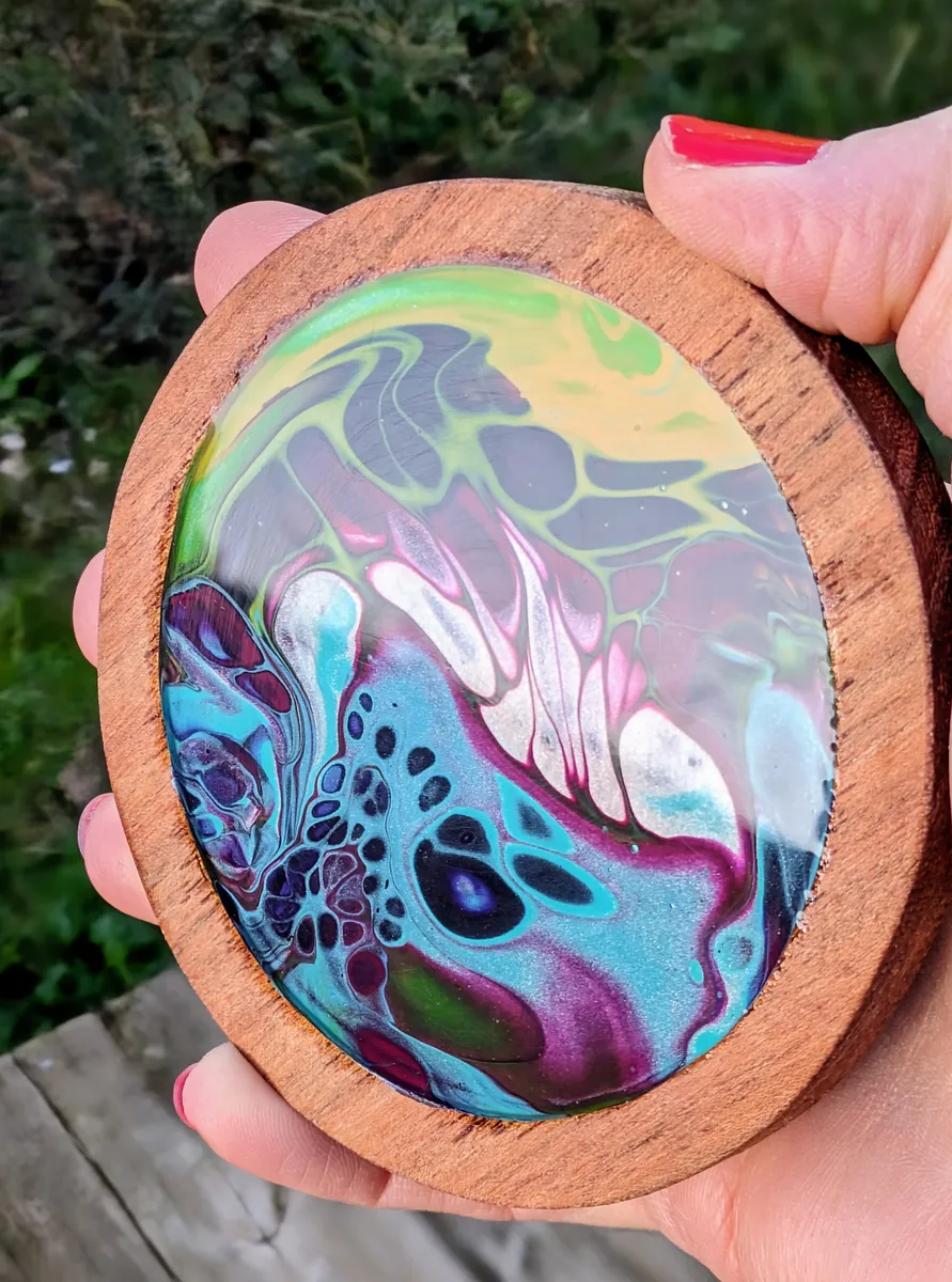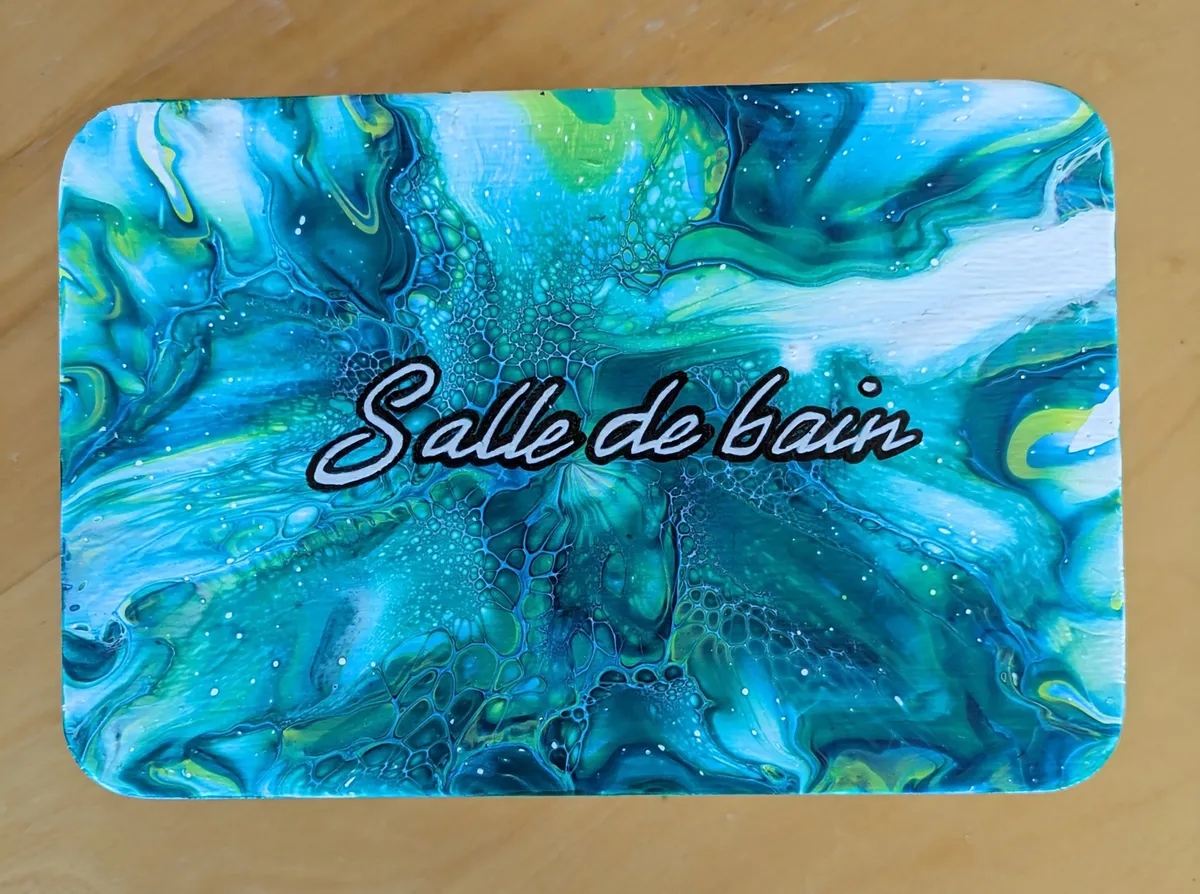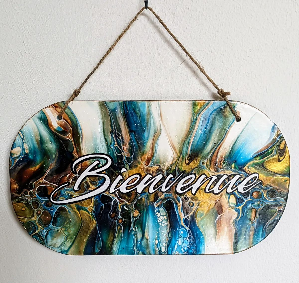Découvrez les dessous de plat, dessous de verre, plaques de porte ou horloges qui apporteront une touche de couleur et d’originalité dans la maison. La peinture est coulée sur du bois ou de la faïence et recouverte d’une couche de résine qui la protège (poussière, UV, chaud, froid...) et lui donne un effet cristallin.