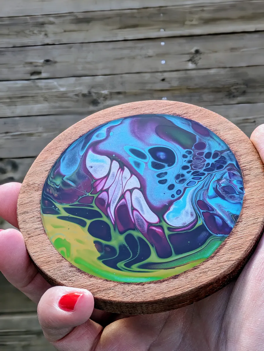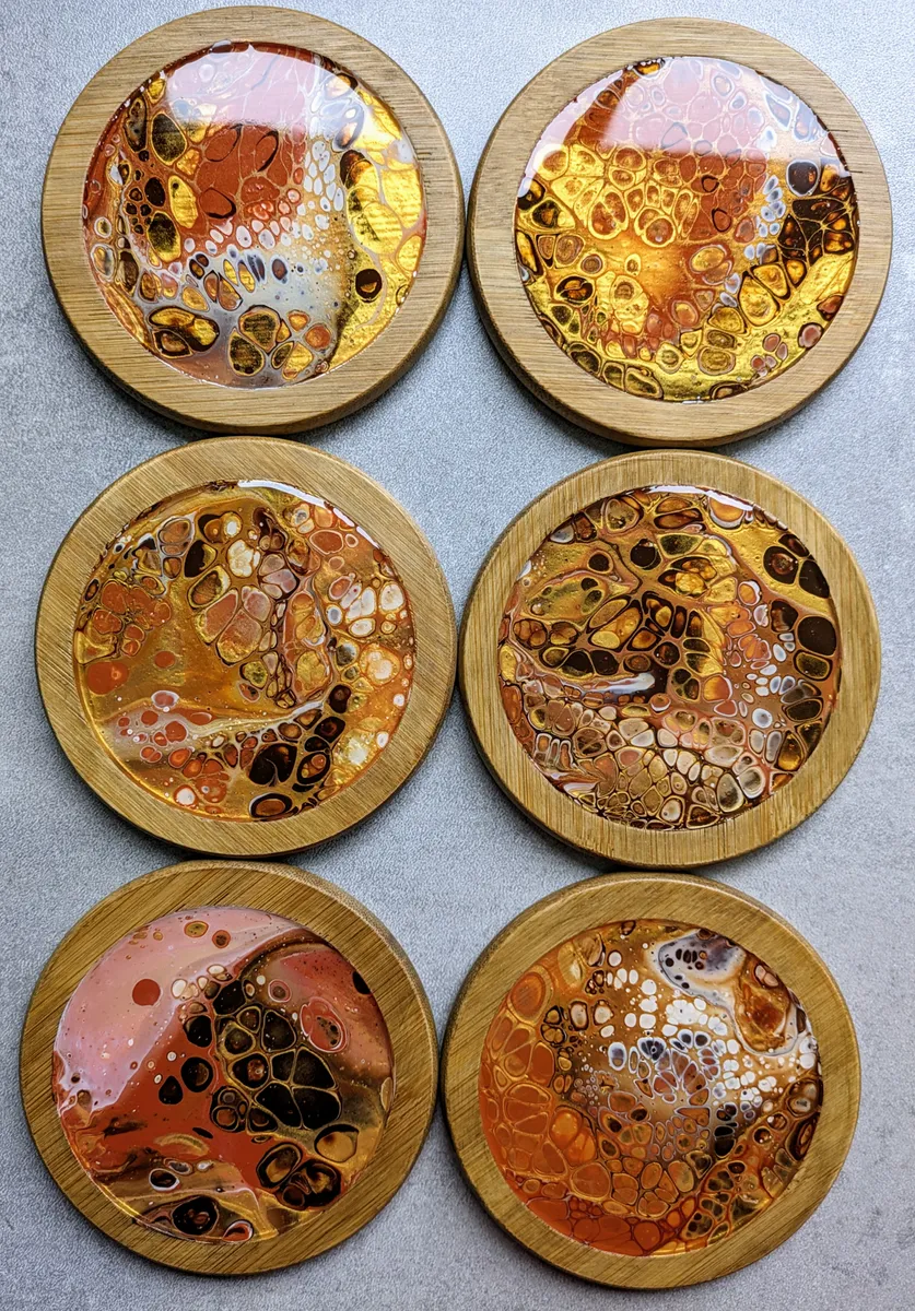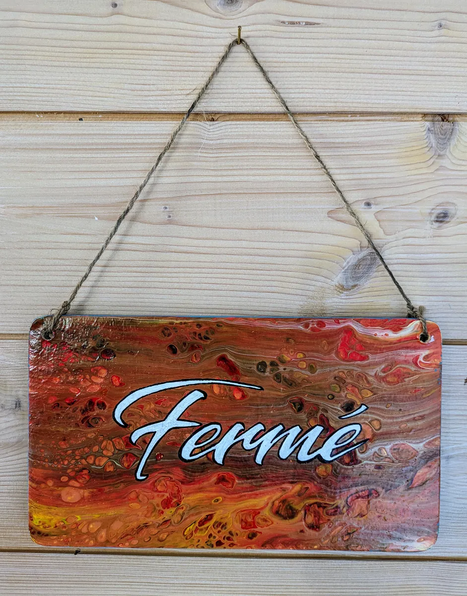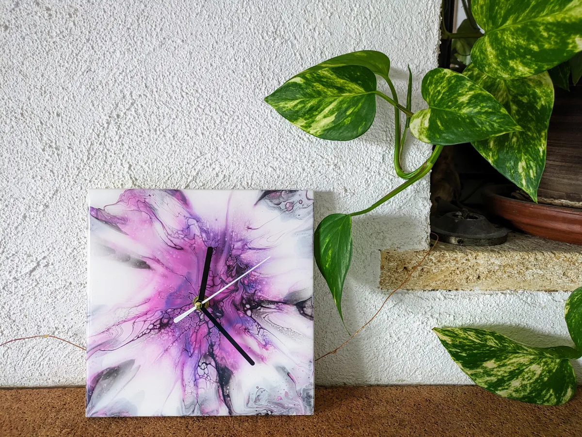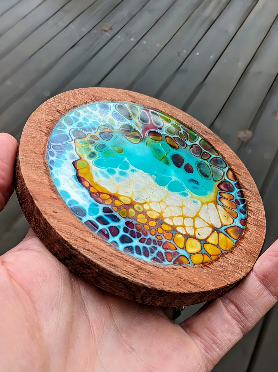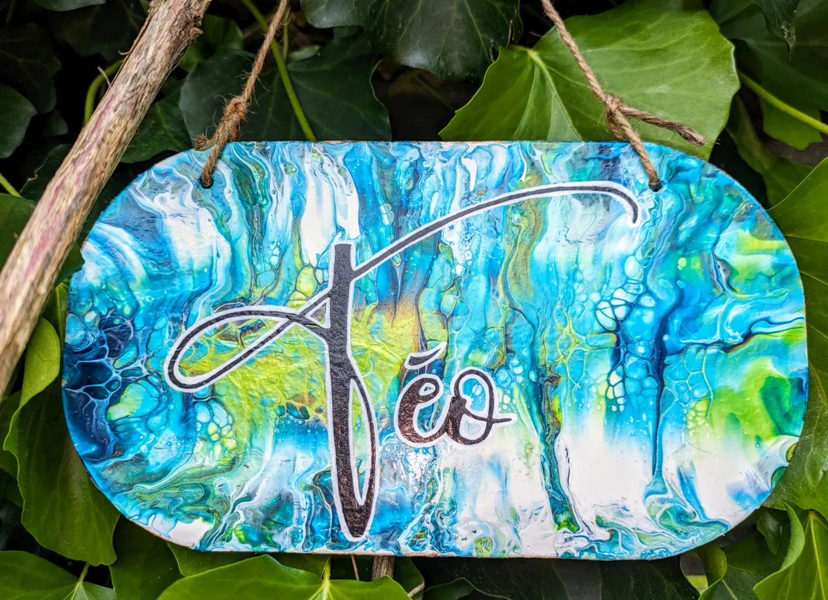 Découvrez les dessous de plat, dessous de verre, plaques de porte ou horloges qui apporteront une touche de couleur et d’originalité dans la maison. La peinture est coulée sur du bois ou de la faïence et recouverte d’une couche de résine qui la protège (poussière, UV, chaud, froid...) et lui donne un effet cristallin.