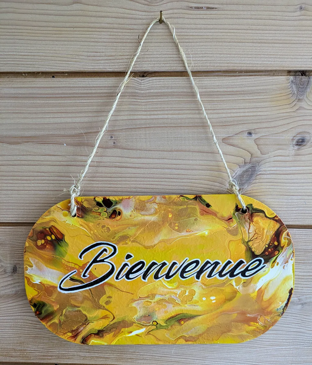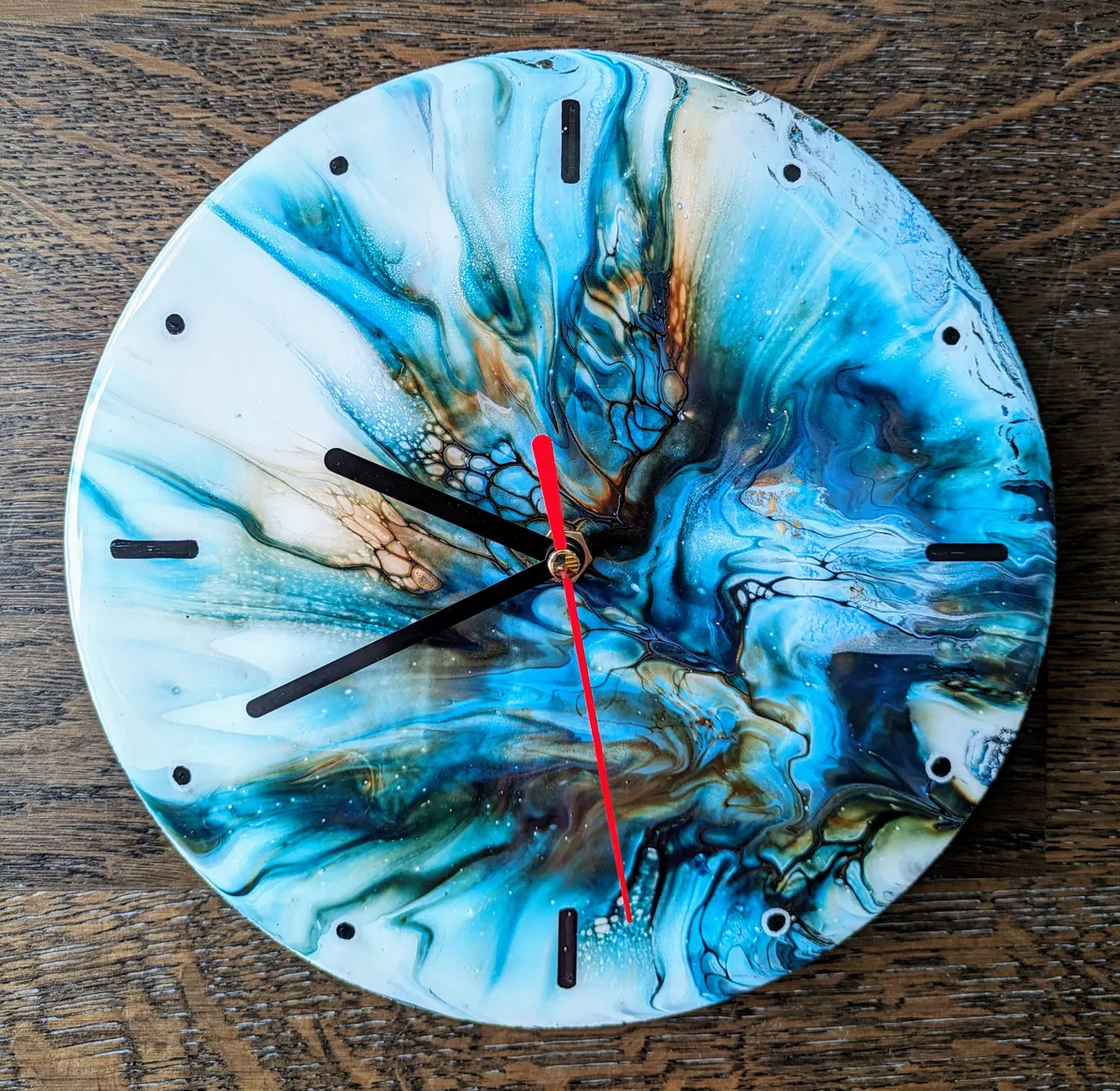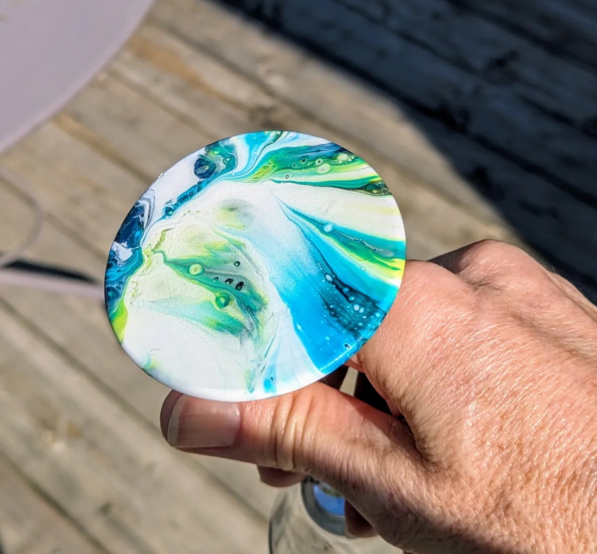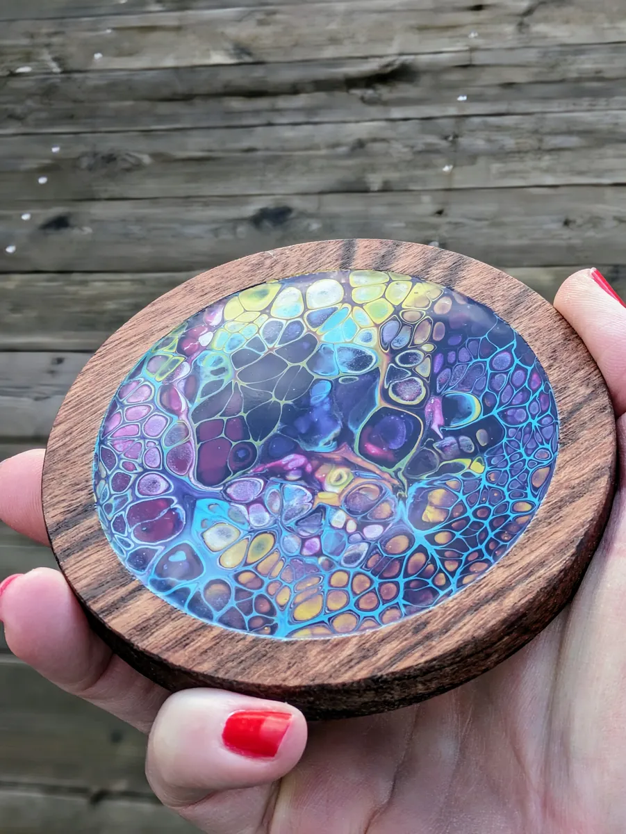 Découvrez les dessous de plat, dessous de verre, plaques de porte ou horloges qui apporteront une touche de couleur et d’originalité dans la maison. La peinture est coulée sur du bois ou de la faïence et recouverte d’une couche de résine qui la protège (poussière, UV, chaud, froid...) et lui donne un effet cristallin.