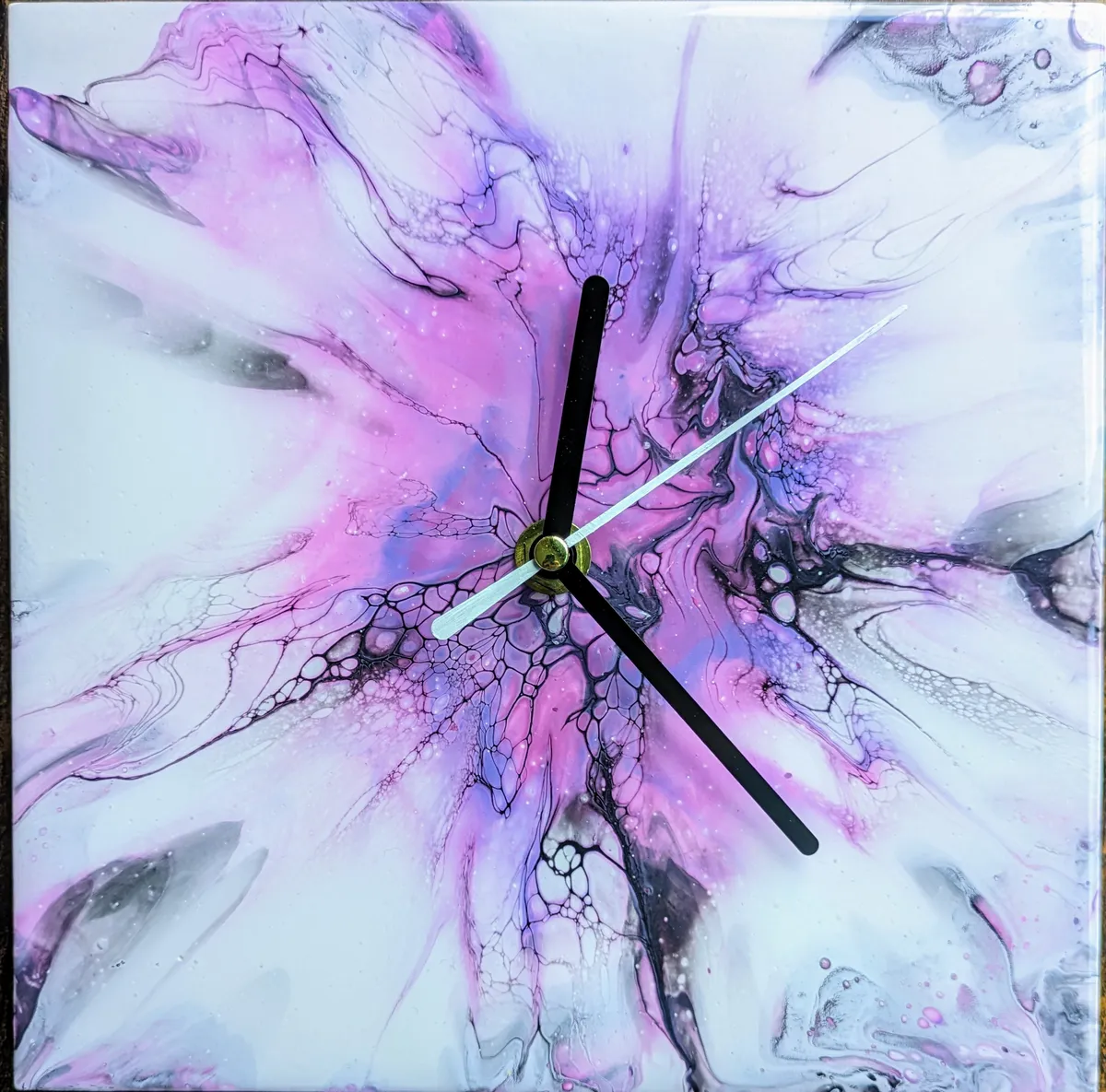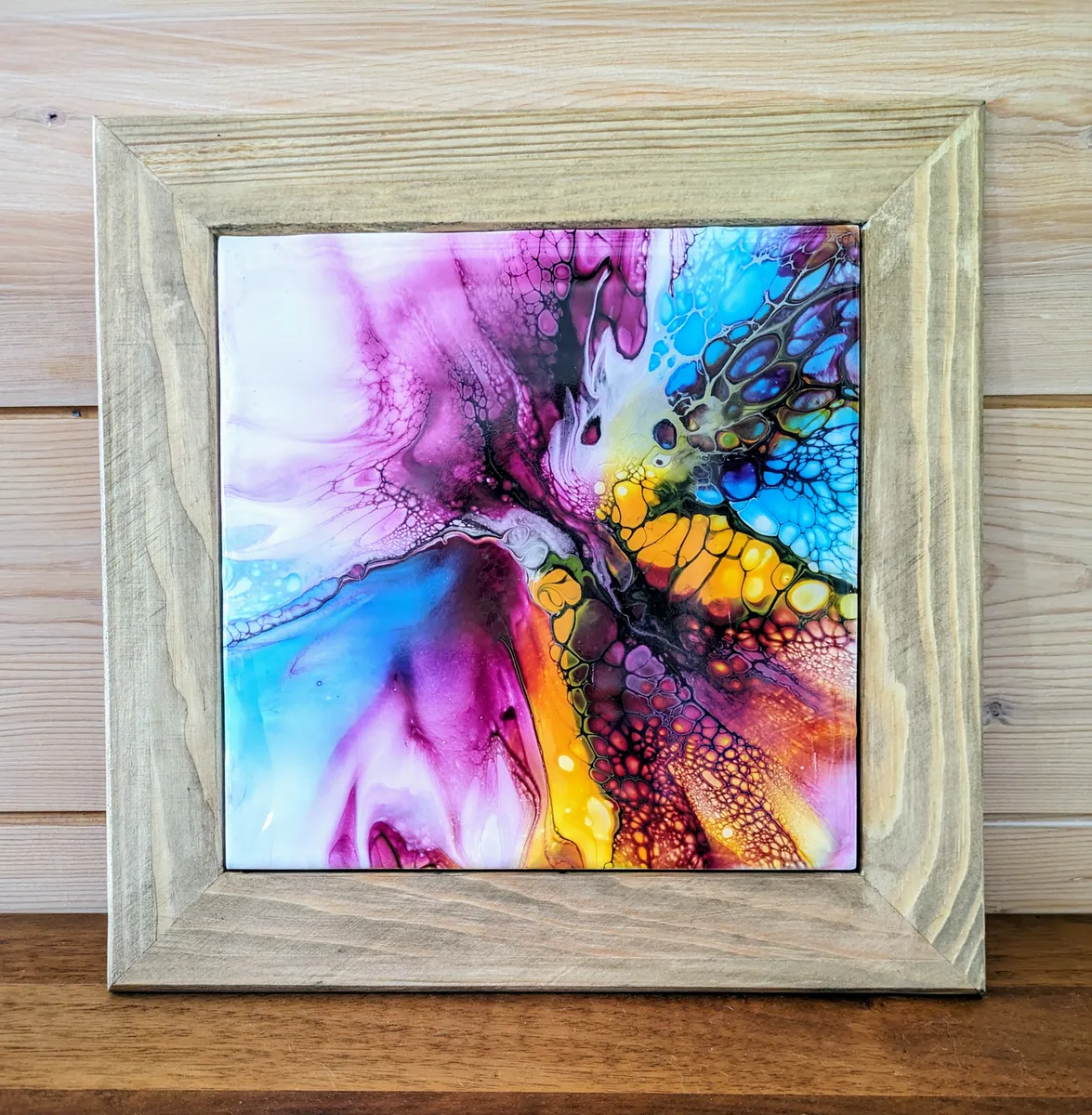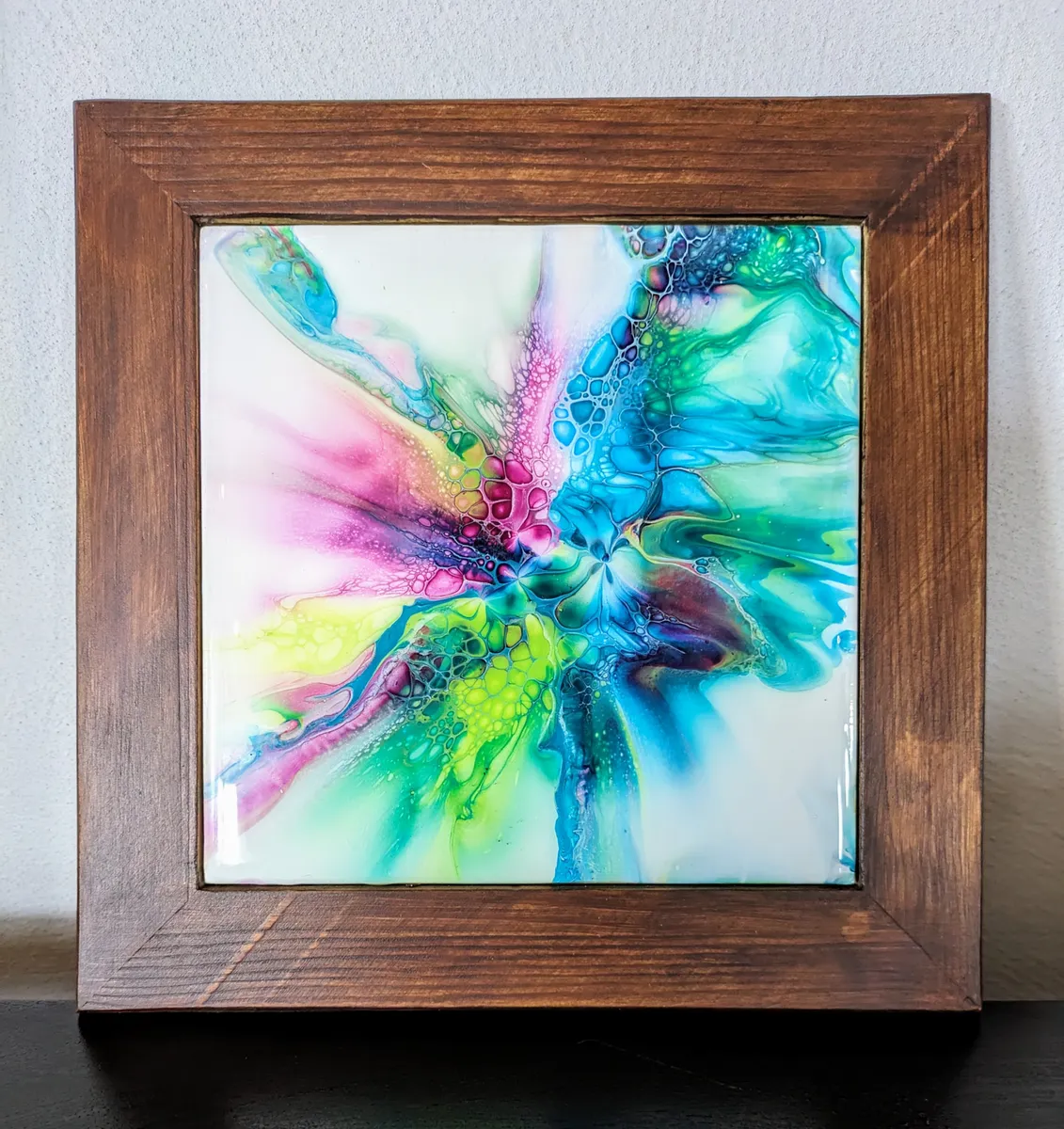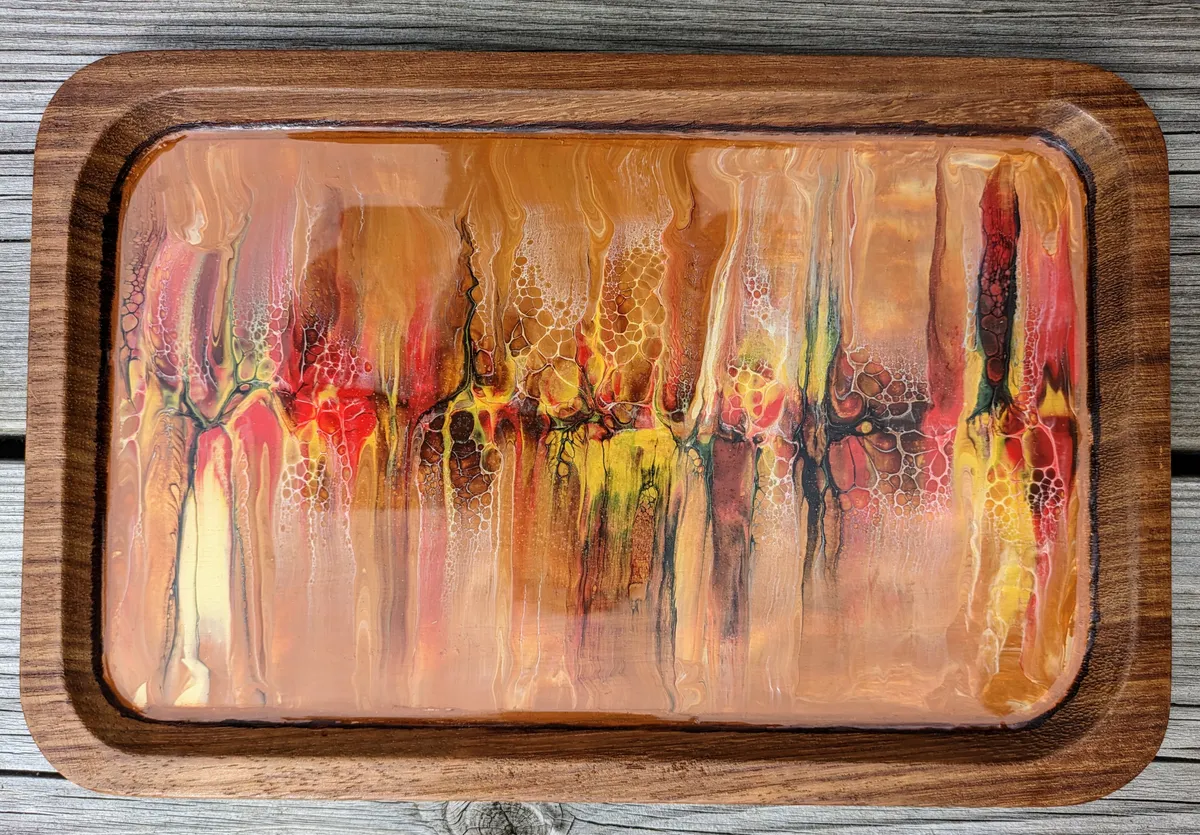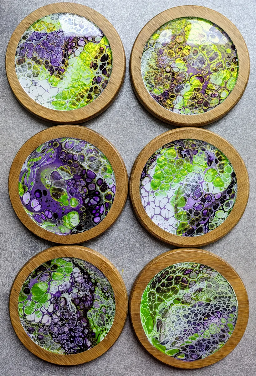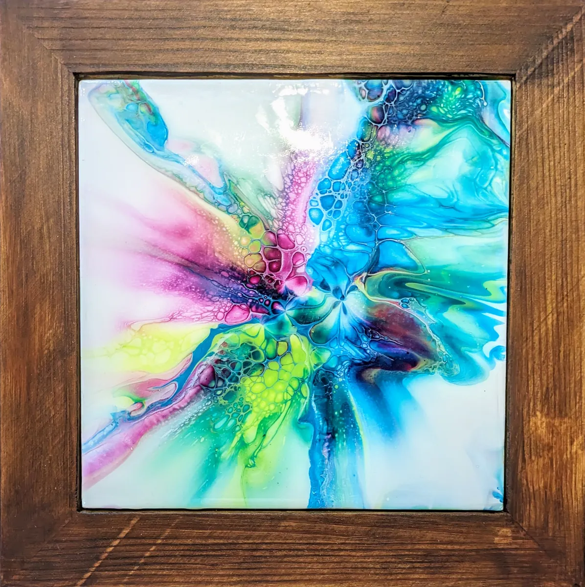 Découvrez les dessous de plat, dessous de verre, plaques de porte ou horloges qui apporteront une touche de couleur et d’originalité dans la maison. La peinture est coulée sur du bois ou de la faïence et recouverte d’une couche de résine qui la protège (poussière, UV, chaud, froid...) et lui donne un effet cristallin.